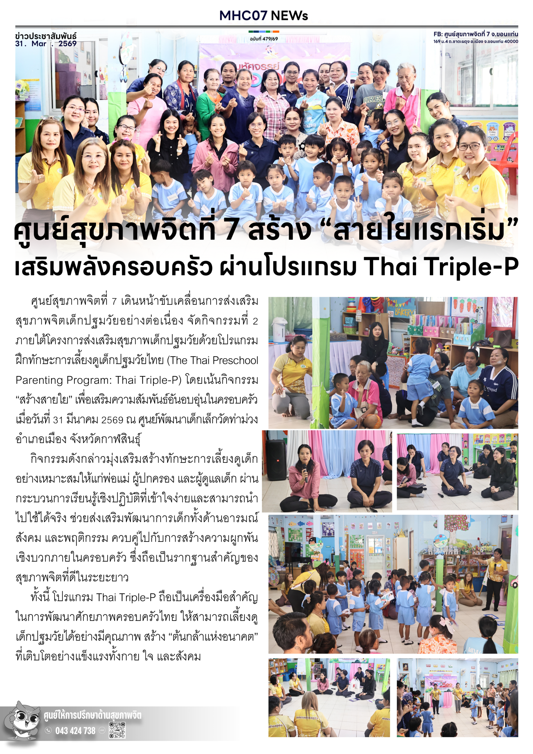 ศูนย์สุขภาพจิตที่ 7 สร้าง “สายใยแรกเริ่ม”เสริมพลังครอบครัว ผ่านโปรแกรม Thai Triple-P 01 เมษายน 2026adminข่าวประชาสัมพันธ์ Views: 8