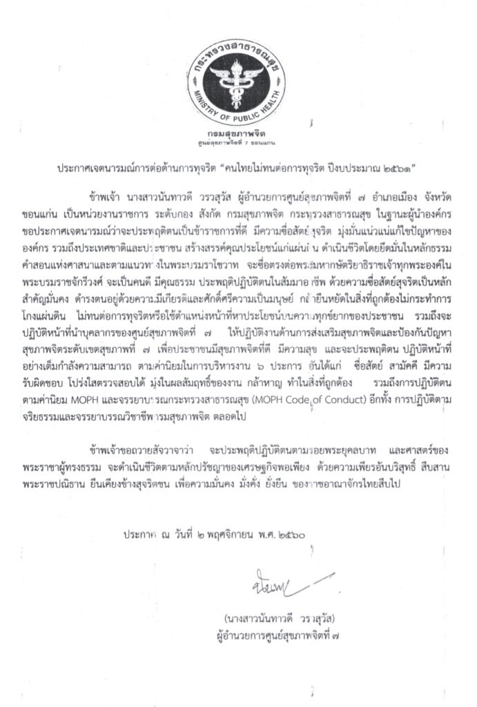 ประกาศเจตนารมณ์การต่อต้านการทุจริต “คนไทยไม่ทนต่อการทุจริต ปีงบประมาณ 2561” 02 พฤศจิกายน 201716 มีนาคม 2018adminข่าวประกาศ Views: 1,358