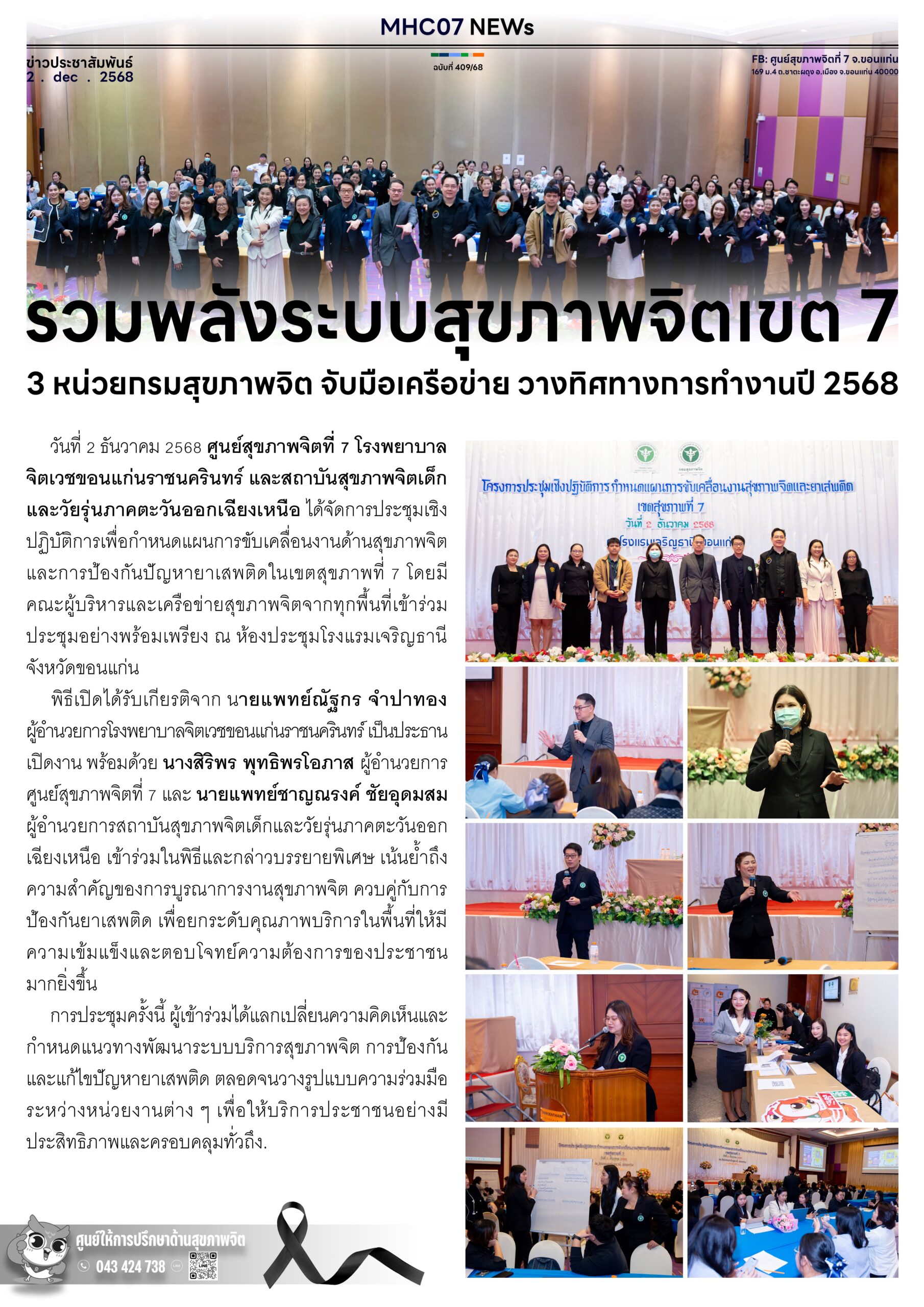 รวมพลังระบบสุขภาพจิตเขต 7 และ 3 หน่วยกรมสุขภาพจิต จับมือเครือข่าย วางทิศทางการทำงานปี 2568 03 ธันวาคม 202503 ธันวาคม 2025adminข่าวประชาสัมพันธ์ Views: 9