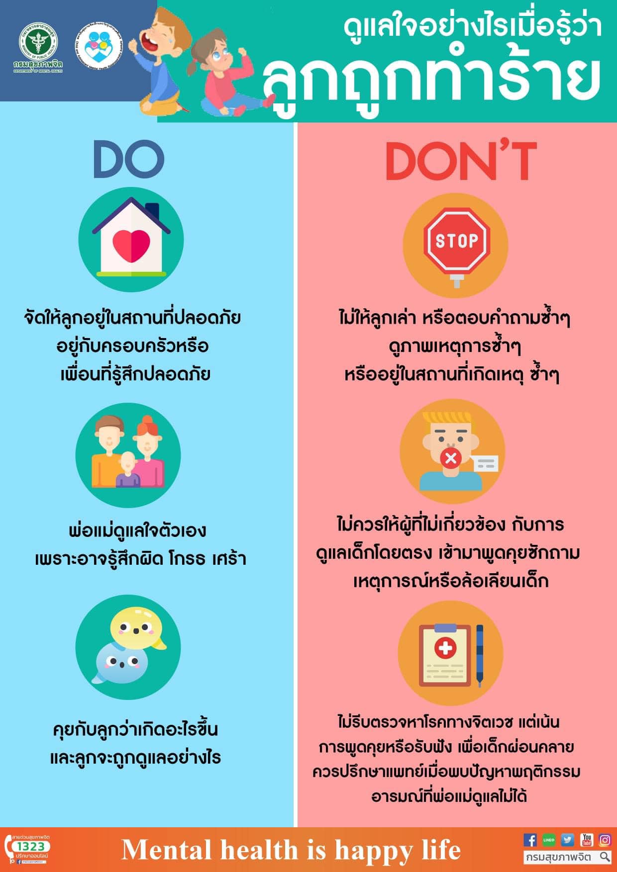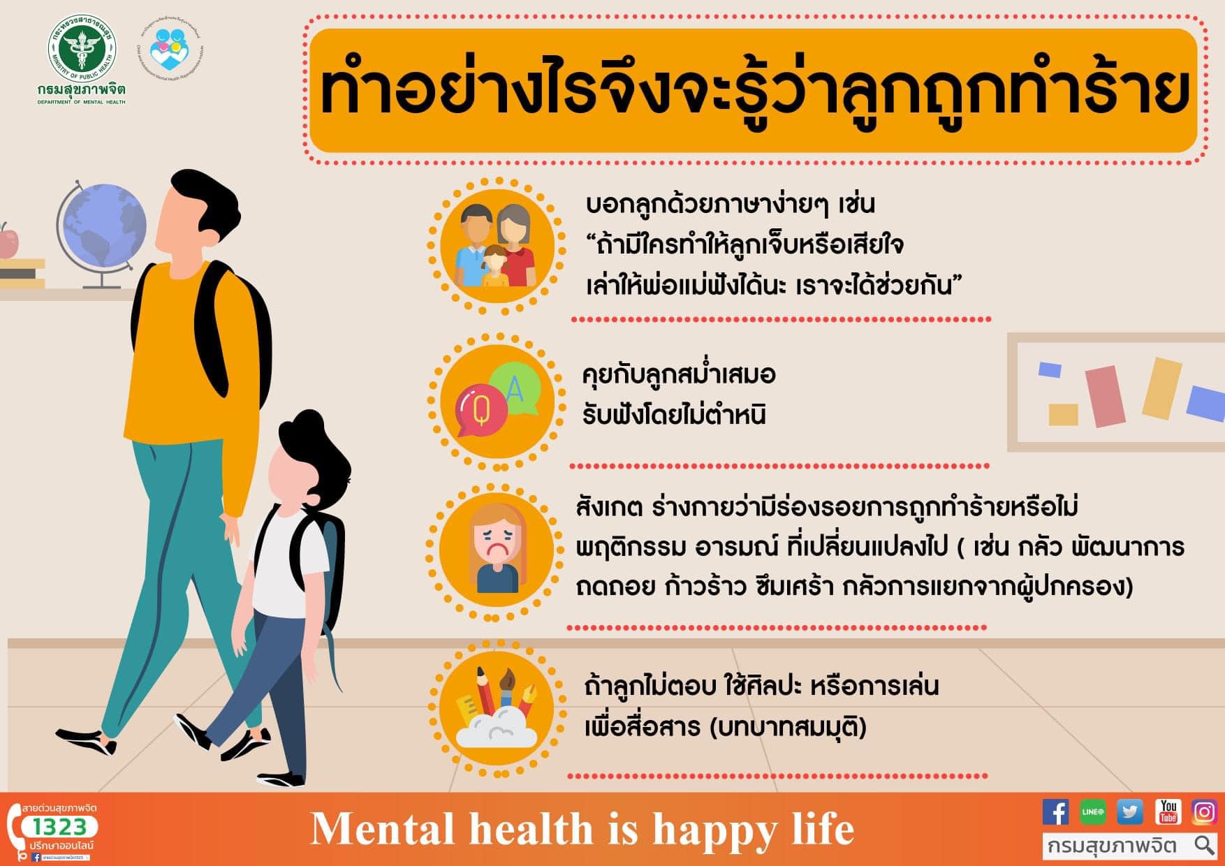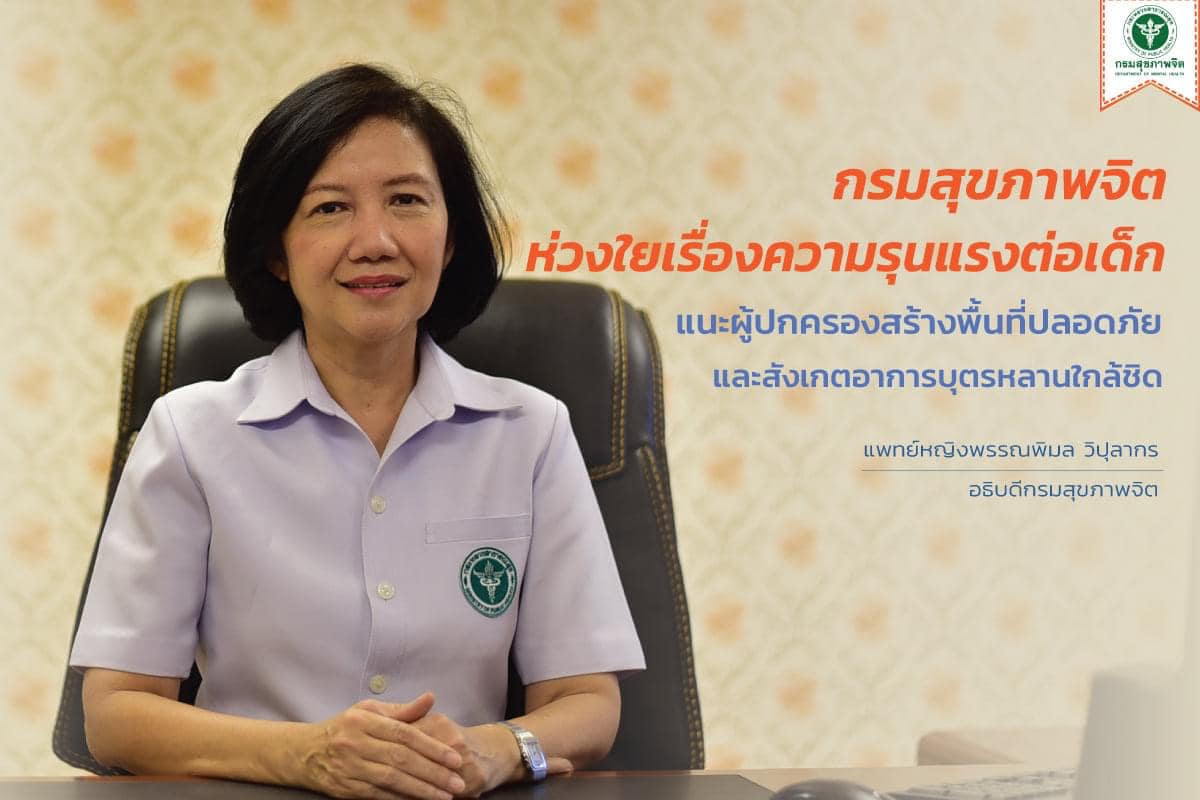 กรมสุขภาพจิตห่วงใยเรื่องความรุนแรงต่อเด็ก แนะผู้ปกครองสร้างพื้นที่ปลอดภัยและสังเกตอาการบุตรหลานใกล้ชิดวันนี้ (5 ตุลาคม 2563) แพทย์หญิงพรรณพิมล วิปุลากร อธิบดีกรมสุขภาพจิต กล่าวถึงข้อวิตกกังวลของประชาชนที่มีถึงกรณีความรุนแรงต่างๆที่เกิดขึ้นในสถานศึกษา โดยเฉพาะความรุนแรงที่มีต่อเด็กเล็ก ซึ่งจากกรณีดังกล่าวทำให้ผู้ปกครองหลายท่านอาจเกิดความกลัวและกังวลใจว่าบุตรหลานของตนเองอาจเป็นผู้ได้รับผลกระทบจากความรุนแรงเช่นเดียวกัน โดยในขณะนี้กรมสุขภาพจิตได้ทำงานประสานกับหน่วยงานต่างๆ เพื่อช่วยเหลือผู้ที่เกี่ยวข้อง และร่วมกันวางแผนในอนาคตเพื่อสร้างความรู้สึกปลอดภัยในโรงเรียนให้กับเด็กและเยาวชนไทยแพทย์หญิงพรรณพิมล กล่าวต่อว่า เด็กและเยาวชนจะมีพัฒนาการที่ดีได้นั้น ต้องมีความรู้สึกปลอดภัยในสถานที่ที่ตนเองต้องดำเนินชีวิตประจำวัน เรียนหนังสือ และทำกิจกรรมต่างๆ ดังนั้นเป้าหมายการดูแลของผู้ปกครองเมื่อเด็กถูกกระทำความรุนแรงหรือสงสัยว่าอาจถูกกระทำความรุนแรง คือการสร้างความรู้สึกปลอดภัยในเด็ก โดยเน้นการสร้างพื้นที่ปลอดภัย ไม่ว่าจะเป็น บ้าน โรงเรียน ครอบครัว เพื่อน และชุมชน พร้อมทั้งให้ความมั่นใจกับเด็กว่าขณะนี้เด็กอยู่ในจุดที่ปลอดภัย ให้ช่องทางในการติดต่อ สื่อสาร หรือบอกเล่าหากเด็กเข้าไปเกี่ยวข้องกับความรุนแรง ให้ความมั่นใจกับเด็กว่าการสื่อสารเมื่อตนเองถูกทำร้ายเป็นสิ่งที่ถูกต้องและสมควรกระทำ ควรให้เด็กได้ทำกิจวัตรประจำวันของตนเองอย่างเป็นปกติให้เร็วที่สุด หลีกเลี่ยงการให้เด็กเล่าซ้ำๆ ตอบคำถามซ้ำๆ ดูภาพเหตุการณ์ซ้ำๆ หรืออยู่ในสถานที่เกิดเหตุซ้ำๆ และไม่ควรให้ผู้ที่ไม่เกี่ยวข้องกับเด็กโดยตรงเข้ามาพูดคุยซักถามเหตุการณ์ หรือล้อเลียนเด็กกรมสุขภาพจิตขอแนะนำวิธีสังเกตง่ายๆที่ผู้ปกครองทำได้ หากสงสัยว่าบุตรหลานของตนอาจเป็นผู้ที่ได้รับผลกระทบจากความรุนแรง โดยมีข้อแนะนำ 3 ประการดังนี้(1) สังเกตร่องรอยการถูกทำร้ายตามร่างกาย พฤติกรรม หรืออารมณ์ที่เปลี่ยนแปลงไปของเด็ก เช่น มีอาการหวาดกลัว มีพฤติกรรมถดถอย ก้าวร้าว ซึมเศร้า หรือกลัวการแยกจากผู้ปกครองมากขึ้น (2) ใส่ใจรับฟัง ใช้เวลาพูดคุยมากขึ้น เข้าใจในสิ่งที่ลูกกำลังสื่อสารโดยไม่ด่วนตัดสิน อาจเริ่มต้นจากคำถามง่าย เช่น “วันนี้เป็นอย่างไรบ้าง” “วันนี้มีความสุขกับอะไรบ้าง” “วันนี้เพื่อนและครูเป็นอย่างไรบ้าง” “วันนี้ไม่ชอบอะไรที่สุด” และเมื่อสงสัยว่าลูกถูกกระทำความรุนแรง สามารถใช้การสนทนาด้วยประโยคง่ายๆ เช่น “ถ้า