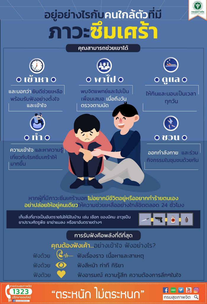 คุณสามารถช่วยเขาได้ด้วยการเข้าหาพร้อมรับฟังอย่างเข้าใจ พาไปพบจิตแพทย์ ทำความเข้าใจและหาความรู้เกี่ยวกับโรคซึมเศร้าและชวนออกกำลังกาย ร่วมกิจกรรมด้วยกัน