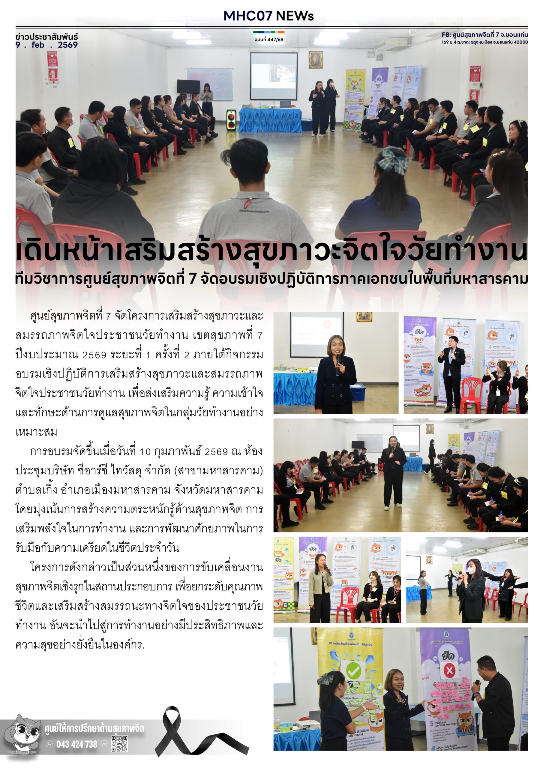 เดินหน้าเสริมสร้างสุขภาวะจิตใจวัยทำงานทีมวิชาการศูนย์สุขภาพจิตที่ 7 จัดอบรมเชิงปฏิบัติการภาคเอกชนในพื้นที่มหาสารคาม 12 กุมภาพันธ์ 2026adminข่าวประชาสัมพันธ์ Views: 7