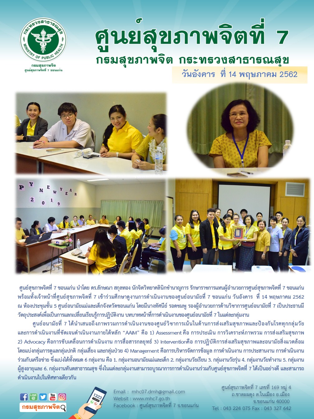 ศูนย์สุขภาพจิตที่ 7 ขอนแก่น นำโดย ดร.ลักษณา สกุลทอง นักจิตวิทยาคลินิกชำนาญการ รักษาราชการแทนผู้อำนวยการศูนย์สุขภาพจิตที่ 7 ขอนแก่น พร้อมทั้งเจ้าหน้าที่ศูนย์สุขภาพจิตที่ 7 เข้าร่วมศึกษาดูงานการดำเนินงานของศูนย์อนามัยที่ 7 ขอนแก่น วันอังคาร ที่ 14 พฤษภาคม 2562 ณ ห้องประชุมชั้น 5 ศูนย์อนามัยแม่และเด็กจังหวัดขอนแก่น โดยมีนางทัศนีย์ รอดชมพู รองผู้อำนวยการด้านวิชาการศูนย์อนามัยที่ 7 เป็นประธานมีวัตถุประสงค์เพื่อเป็นการแลกเปลี่ยนเรียนรู้การปฏิบัติงาน บทบาทหน้าที่การดำเนินงานของศูนย์อนามัยที่ 7 ในแต่ละกลุ่มภารกิจ