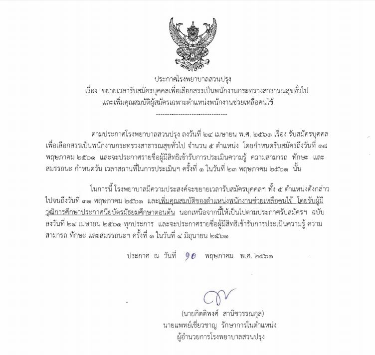 โรงพยาบาลสวนปรุง ขยายเวลารับสมัครบุคคลเพื่อเลือกสรรเป็นพนักงานกระทรวงสาธารณสุขทั่วไปและเพิ่มคุณสมบัติผู้สมัครเฉพาะตำแหน่งพนักงานช่วยเหลือคนไข้ 15 พฤษภาคม 2018adminข่าวประกาศ, ข่าวสมัครงาน รายเอียดการรับสมัคร รายละเอียดเพิ่มเติม Views: 1,092