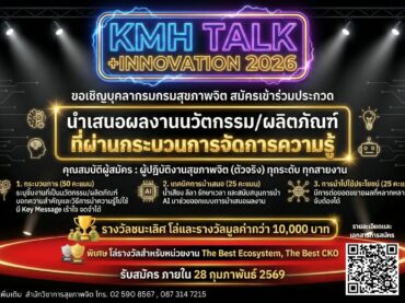 เชิญชวนบุคลากรกรมสุขภาพจิตทุกระดับ ร่วมถ่ายทอด “ผลงานนวัตกรรม/ผลิตภัณฑ์”ที่ผ่านกระบวนการจัดการความรู้ ให้โลกได้เห็นพลังของงานสุขภาพจิตที่คุณสร้างจริง ทำจริง ใช้ได้จริง ในเวที KMH Talk (ภาคอีสาน)