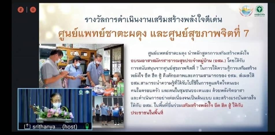 ศูนย์แพทย์ชาตะผดุง โรงพยาบาลขอนแก่น สำนักงานสาธารณสุขอำเภอเมืองขอนแก่น สำนักงานสาธารณสุขจังหวัดขอนแก่น และศูนย์สุขภาพจิตที่ 7 บูรณาการความร่วมมือ นำหลักสูตรการเสริมสร้างพลังใจ อบรมอาสาสมัครสาธารณสุขประจำหมู่บ้าน โดยได้รับการสนับสนุนจากศูนย์สุขภาพจิตที่ 7 ในการให้ความรู้เสริมสร้างพลังใจ อึด ฮึด สู้ ดึงศักยภาพและความสามารถของ อสม.ส่งผลให้อสม.สามารถนำความรู้ที่ได้รับไปใช้ในการดูแลจิตใจของตนเองคนในครอบครัวและคนในชุมชนของตนเองโดยพลังจิตอาสาและการดำเนินการอย่างต่อเนื่องจนเป็นต้นแบบและสร้างแรงบันดาลใจให้กับอสม.ในพื้นที่ร่วมเสริมสร้างพลังใจ อึด ฮึด สู้ ให้กับประชาชนในพื้นที่