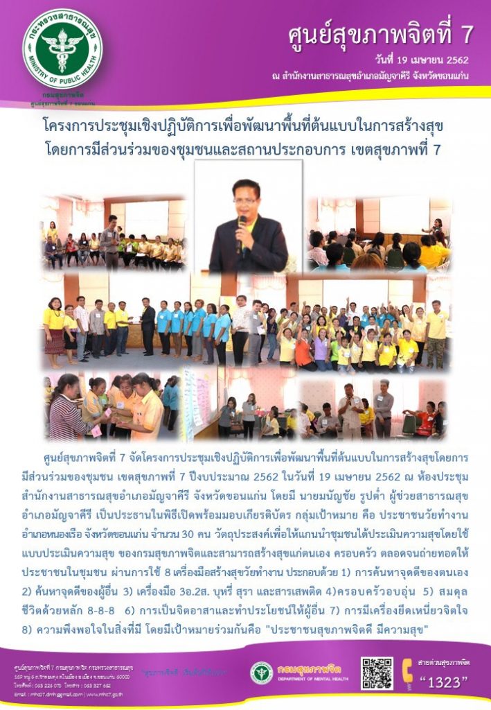 ศูนย์สุขภาพจิตที่ 7 จัดโครงการประชุมเชิงปฏิบัติการเพื่อพัฒนาพื้นที่ต้นแบบในการสร้างสุขโดยการมีส่วนร่วมของชุมชน เขตสุขภาพที่ 7 ปีงบประมาณ 2562 ในวันที่ 19 เมษายน 2562 ณ ห้องประชุมสำนักงานสาธารณสุขอำเภอมัญจาคีรี จังหวัดขอนแก่น 23 เมษายน 201923 เมษายน 2019adminข่าวประกาศ Views: 988