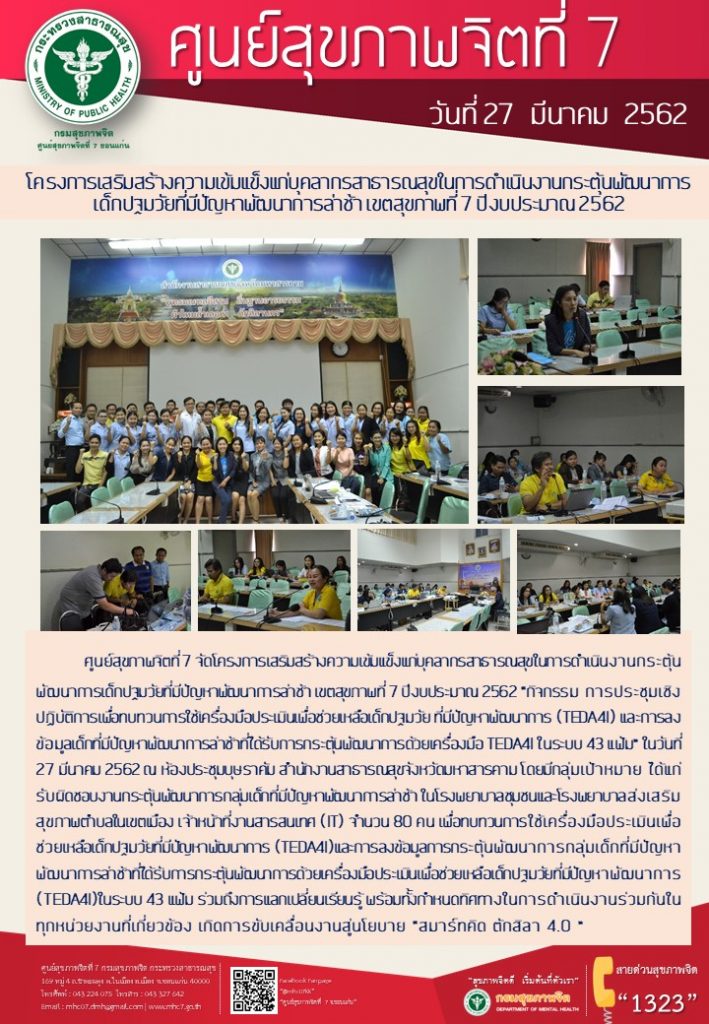 ศูนย์สุขภาพจิตที่ 7 จัดโครงการเสริมสร้างความเข้มแข็งแก่บุคลากรสาธารณสุขในการดำเนินงานกระตุ้นพัฒนาการเด็กปฐมวัยที่มีปัญหาพัฒนาการล่าช้า เขตสุขภาพที่ 7 ปีงบประมาณ 2562 “กิจกรรม การประชุมเชิงปฏิบัติการเพื่อทบทวนการใช้เครื่องมือประเมินเพื่อช่วยเหลือเด็กปฐมวัย ที่มีปัญหาพัฒนาการ (TEDA4I) และการลงข้อมูลเด็กที่มีปัญหาพัฒนาการล่าช้าที่ได้รับการกระตุ้นพัฒนาการด้วยเครื่องมือ TEDA4I ในระบบ 43 แฟ้ม” ในวันที่ 27 มีนาคม 2562 ณ ห้องประชุมบุษราคัม สำนักงานสาธารณสุขจังหวัดมหาสารคาม โดยมีกลุ่มเป้าหมาย ได้แก่รับผิดชอบงานกระตุ้นพัฒนาการกลุ่มเด็กที่มีปัญหาพัฒนาการล่าช้า ในโรงพยาบาลชุมชนและโรงพยาบาลส่งเสริมสุขภาพตำบลในเขตเมือง เจ้าหน้าที่งานสารสนเทศ (IT) จำนวน 80 คน เพื่อทบทวนการใช้เครื่องมือประเมินเพื่อช่วยเหลือเด็กปฐมวัยที่มีปัญหาพัฒนาการ (TEDA4I)และการลงข้อมูลการกระตุ้นพัฒนาการกลุ่มเด็กที่มีปัญหาพัฒนาการล่าช้าที่ได้รับการกระตุ้นพัฒนาการด้วยเครื่องมือประเมินเพื่อช่วยเหลือเด็กปฐมวัยที่มีปัญหาพัฒนาการ (TEDA4I)ในระบบ 43 แฟ้ม ร่วมถึงการแลกเปลี่ยนเรียนรู้ พร้อมทั้งกำหนดทิศทางในการดำเนินงานร่วมกันใน ทุกหน่วยงานที่เกี่ยวข้อง เกิดการขับเคลื่อนงานสู่นโยบาย “สมาร์ทคิด ตักสิลา 4.0 ”