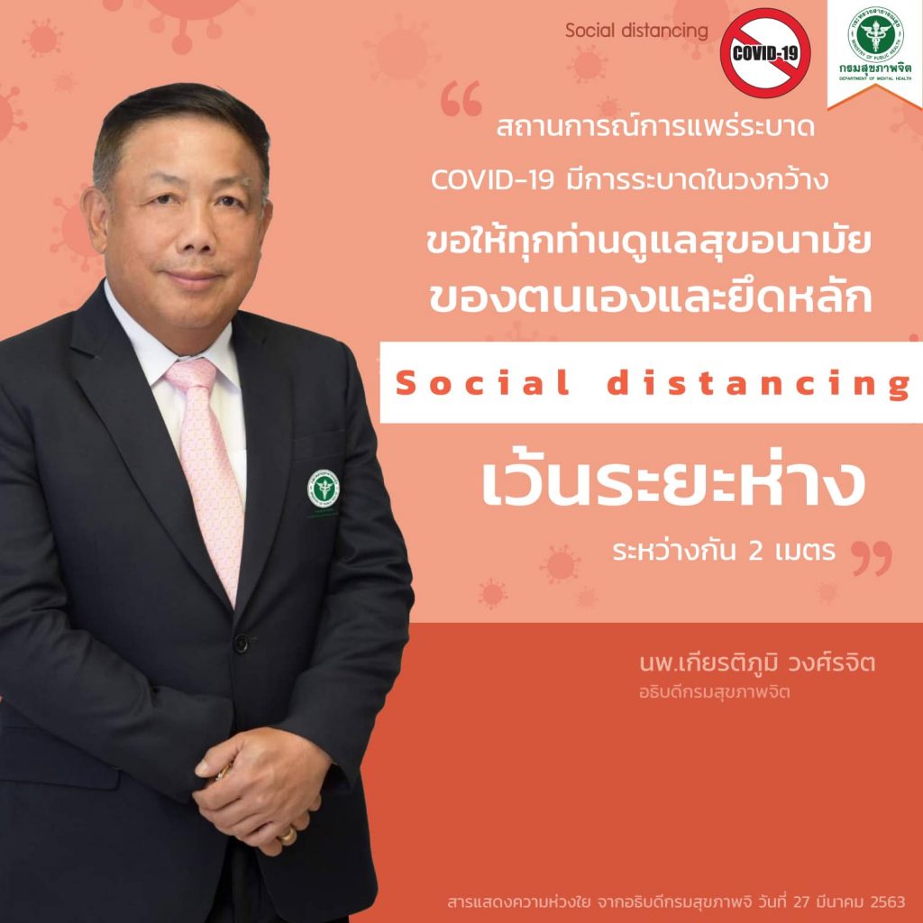 “สถานการณ์การแพร่ระบาด COVID-19 มีการระบาดในวงกว้าง ท่านทั้งหลายที่ทำงานอยู่ ขอให้ทุกท่านดูแลสุขภาพอนามัยของตนเองและยึดหลัก Social distancing เว้นระยะห่างระหว่าง 2 เมตร”