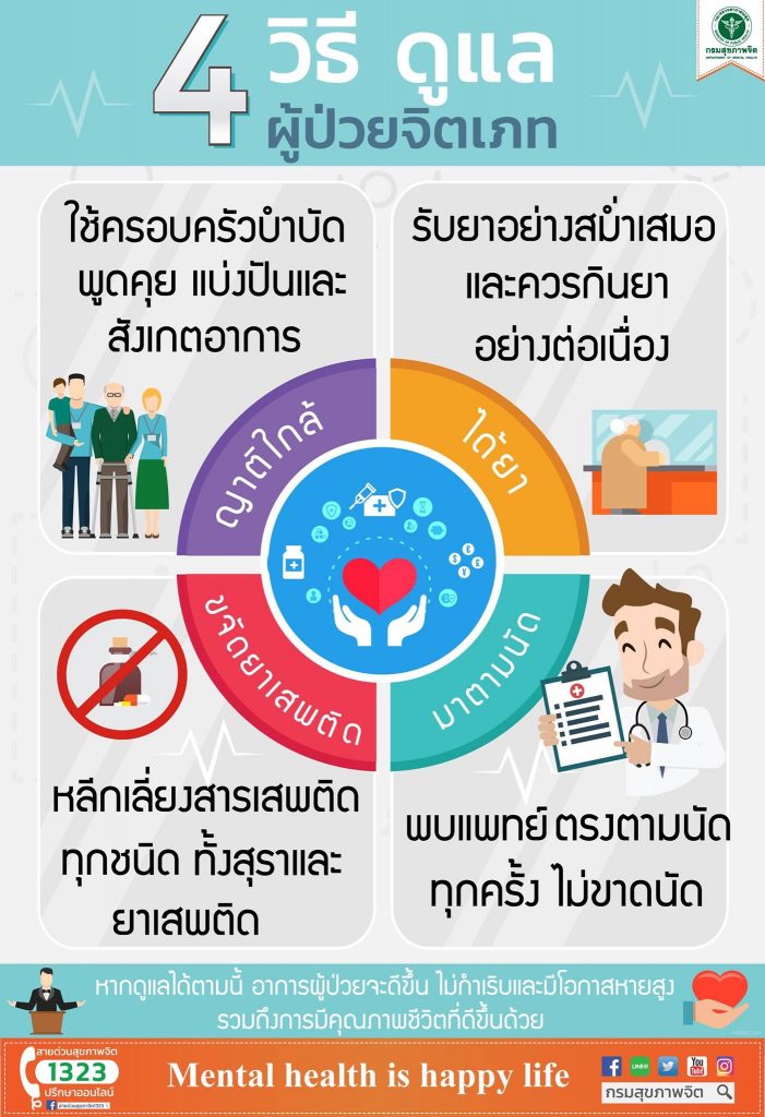 - ญาติใกล้ มีญาติคอยดูแล ใช้ครอบครัวบำบัด พร้อมพูดคุยแบ่งปันความรู้สึกแก่กันได้ และสังเกตอาการเตือนของผู้ป่วยก่อนนำเข้าพบแพทย์