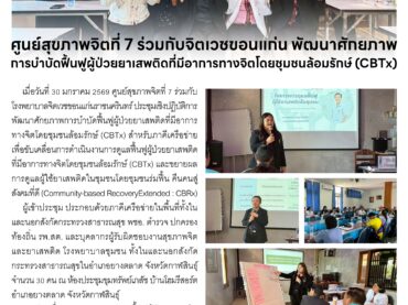 ศูนย์สุขภาพจิตที่ 7 ร่วมกับจิตเวชขอนแก่น พัฒนาศักยภาพการบำบัดฟื้นฟูผู้ป่วยยาเสพติดที่มีอาการทางจิตโดยชุมชนล้อมรักษ์ (CBTx) 02 กุมภาพันธ์ 2026adminข่าวประชาสัมพันธ์
